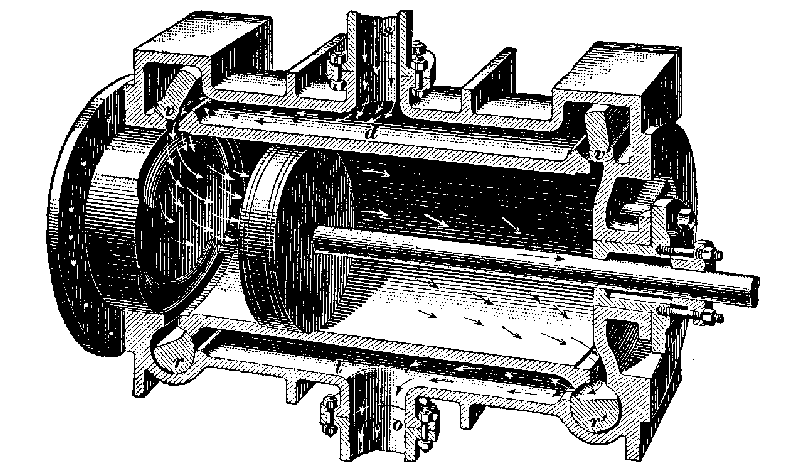 Steam enters through the vertical pipe (s) at the top into the steam chest (d) the upper valves (v) are the steam inlet valves and are partly rotated to uncover the ports and admit steam alternately into either end of the cylinder